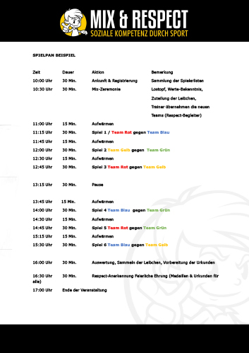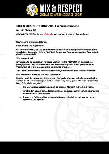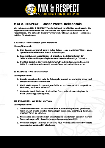 MIX & RESPECT ist mehr als ein Turnierkonzept – es ist eine Bewegung für gelebte Fairness. Wir richten die Turniere nicht selbst aus, sondern unterstützen Euren Verein kostenlos dabei, ein Leuchtturmprojekt für soziale Kompetenz in Deiner Region zu werden.